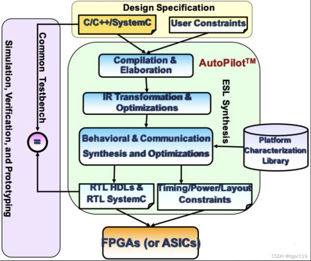 前端,它使用了LLVM的编译器架构,能够使用C,C++,OSCI SystemC等语言,使用llvm-gcc编译器将高层语言模型转换为IR,优化后,再根据具体的硬件平台,生成RTL代码。