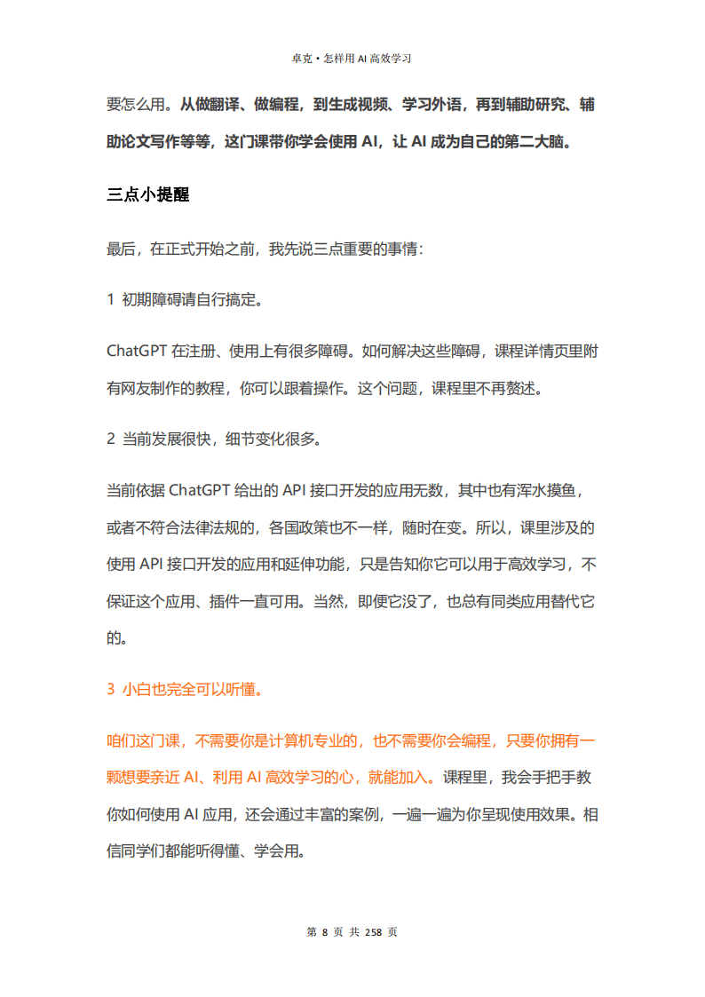 《怎样用AI高效学习》由卓克主讲,课程探讨了如何利用AI提高学习效率,包括正确提问、利用技巧提高AI输出质量、用AI进行翻译、辅助论文写作、学习语言、处理视频、进行提问式学习、了解下一代GPT以及AI的不同演化分支等内容。通过案例展示,如让ChatGPT辅助论文提纲撰写、生成视频字幕和脚本、进行提问式学习等,课程介绍了AI在学习中的多种应用。同时,课程还提及了当前AI的一些限制,如对长内容支持不足等问题,并对AI的未来发展进行了展望,如AutoGPT等自动执行工具的出现,以及Anthropic、CovariantAI、ADEPT等公司在AI不同分支上的发展。总之,课程旨在帮助学习者更好地利用AI提升学习效果和效率。