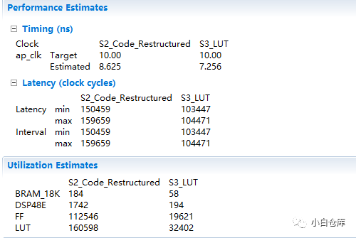 然后大家对每块代码都进行个性的优化,部分代码如下。void fft_stage_1( DTYPE X_R[SIZE], DTYPE X_I[SIZE], DTYPE Out_R[SIZE], DTYPE Out_I[SIZE]) { int stage = 1; int DFTpts = 1 << stage; // DFT = 2^stage = points in sub DFT int numBF = DFTpts / 2; // Butterfly WIDTHS in sub-DFT DTYPE e = -6.283185307178 / DFTpts; // Perform butterflies for j-th stage butterfly_loop: for (int j = 0; j < numBF; j++) {#pragma HLS LOOP_TRIPCOUNT min=1 max=1 avg=1 // Compute butterflies that use same W**k dft_loop: for (int i = j; i < SIZE; i += DFTpts) {#pragma HLS PIPELINE II=6#pragma HLS LOOP_TRIPCOUNT min=512 max=512 avg=512 DTYPE c = cos_coefficients_table[j<<(10-stage)]; DTYPE s = sin_coefficients_table[j<<(10-stage)]; int i_lower = i + numBF; // index of lower point in butterfly DTYPE temp_R = X_R[i_lower] * c - X_I[i_lower] * s; DTYPE temp_I = X_I[i_lower] * c + X_R[i_lower] * s; Out_R[i_lower] = X_R[i] - temp_R; Out_I[i_lower] = X_I[i] - temp_I; Out_R[i] = X_R[i] + temp_R; Out_I[i] = X_I[i] + temp_I; } }}void fft_stage_2( DTYPE X_R[SIZE], DTYPE X_I[SIZE], DTYPE Out_R[SIZE], DTYPE Out_I[SIZE]) { int stage = 2; int DFTpts = 1 << stage; // DFT = 2^stage = points in sub DFT int numBF = DFTpts / 2; // Butterfly WIDTHS in sub-DFT DTYPE e = -6.283185307178 / DFTpts; // Perform butterflies for j-th stage butterfly_loop: for (int j = 0; j < numBF; j++) {#pragma HLS LOOP_TRIPCOUNT min=2 max=2 avg=2 // Compute butterflies that use same W**k dft_loop: for (int i = j; i < SIZE; i += DFTpts) {#pragma HLS PIPELINE II=6#pragma HLS LOOP_TRIPCOUNT min=256 max=256 avg=256 DTYPE c = cos_coefficients_table[j<<(10-stage)]; DTYPE s = sin_coefficients_table[j<<(10-stage)]; int i_lower = i + numBF; // index of lower point in butterfly DTYPE temp_R = X_R[i_lower] * c - X_I[i_lower] * s; DTYPE temp_I = X_I[i_lower] * c + X_R[i_lower] * s; Out_R[i_lower] = X_R[i] - temp_R; Out_I[i_lower] = X_I[i] - temp_I; Out_R[i] = X_R[i] + temp_R; Out_I[i] = X_I[i] + temp_I; } }}根据对比报告可以看出4. 结论
