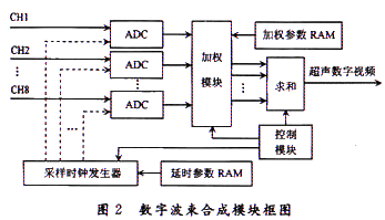8个通道的回波信号经过A/D采样后,送入FPGA,缓冲之后同步读出进入加权模块,加权模块由8个无符号为数字乘法器组成。回波信号分别与加权参数相乘后得到具有动态聚焦和加权特性的数据。8组数据再经过3级加法器就得到波束合成之后的超声数字视频数据。