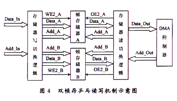 (1)采集过程未开始,帧存A为等待写状态,获得写互斥锁;帧存B为等待读状态,获得读互斥锁;(2)帧存写控制器收到一帧开始信号,判断为采集开始,设置帧存A写信号WE2 A有效,帧存A开始写入当前帧数据;同时帧存读控制器设置帧存B读信号OE2_B有效,帧存B则开始读出所存数据;(3)一帧结束,帧存A写结束,释放写互斥锁;帧存B读结束,释放读读斥锁;(4)等待另一帧开始,帧存A获得读互斥锁;帧存B获得写读斥锁;(5)另一帧开始,写控制器设置帧存B写信号WE2B有效,帧存B开始写入数据;读控制器设置帧存A读信号OE2 A有效,帧存A则开始读出数据。