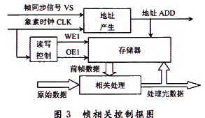 3.2 帧相关处理帧相关模块如图3所示,由帧相关控制器和一片存储器组成,进行帧相关的存储器采用大小为256 kB的静态存储器(SRAM)。帧相关控制器由FPGA实现,完成地址产生、存储器读写控制、帧相关计算功能,因为实时性的要求,即保证送往后端双帧存的数据不能中断,所以考虑到对逐个象素数据读写的同时就进行相关处理,而且需要在同一个象素时钟周期内完成。读写控制器在1个象素时钟周期的前半段需要读出存储器中的数据和当前帧数据进行相关处理;时钟周期的后半段再将相关处理完的数据写入存储器以备后用,这样送往后端双帧存的数据依然是和象素时钟对应的连续象素数据。帧相关的工作流程如下:(1)地址产生。地址的产生由一个象索计数器实现,输入信号为帧同步信号VS和象素时钟CLK。前端提供的帧同步信号VS为该计数器的复位信号,在每一帧的开始,计数器清零,然后根据象素时钟CLK计数生成地址,每个象素时钟周期内地址不变,依据此地址进行存储器的读写。(2)读取已有数据及相关处理。在一个象素时钟周期的前半段,也就是CLK跳变为高电平时,读写控制器输出的读信号OEl为有效,读出前帧中一个象素的数据,送到FPGA内部实现的加法器的A口,与同时到达B口的当前帧的对应象素数据相加平均。(3)数据保存及传输。在同一个象素时钟周期的后半段,也就是CLK跳变为低电平时,读写控制器输出的写信号WEl为有效,相关处理完的数据写回原来的地址,同时该数据也送往帧存写控制模块。