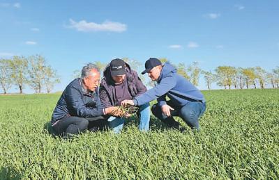 西北农林科技大学教授张正茂(左一)与哈萨克斯坦专家观察农作物生长情况。