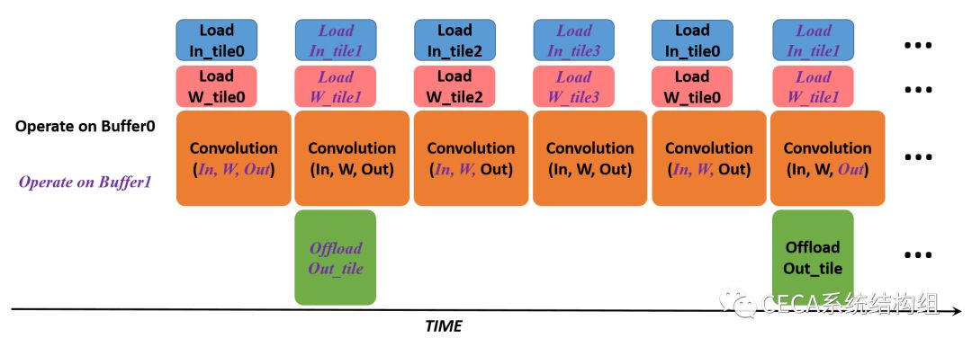观察上图,我们不难发现,该加速器的处理还存在进一步优化的空间,即:粗粒度流水。由于数据搬运过程与卷积运算过程是在不同的硬件模块中实现的,原理上我们可以将这两个过程做一个粗粒度的流水优化,从而进一步提升加速器的处理效率,而对应方法就是一个硬件架构设计中常见的方法:Double-buffering或者Ping-pong Buffer。