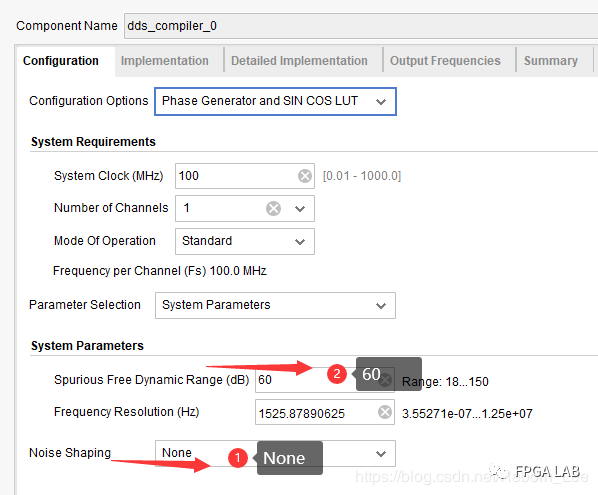 而Spurious Free Dynamic Range (SFDR)翻译为无杂散动态范围,和输出数据宽度以内部总线宽度以及各种实现策略有关;假设我需求的数据宽度为10位,Noise Shaping选为None,则SFDR为60,输入IP定制页面: