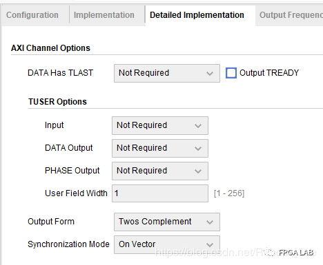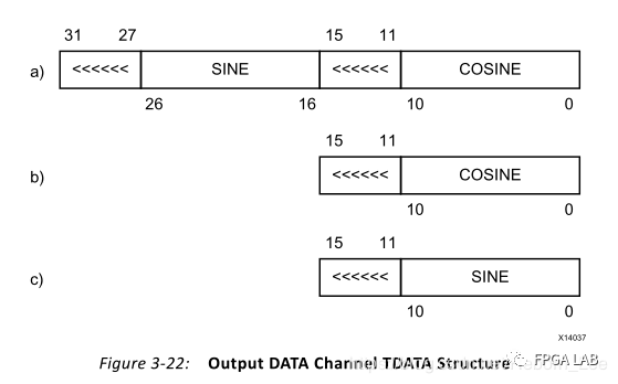 下图显示了这三种配置的TDATA的内部结构。正交输出,仅余弦和仅正弦。例如,在图中显示了11位输出,符号扩展到16位。<<<表示符号扩展名:因此我们可以这么认为,由于存在扩展符号位的关系,我们可以提取低一半的数据为COS,高一半的数据未SIN。