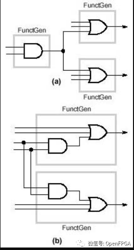 采用图b结构,其实现结果等效于图a结构,虽然增加了一个2输入与门并且逻辑级数与图a一样也是2级但我们根据LUT特点它只占用2个LUT: