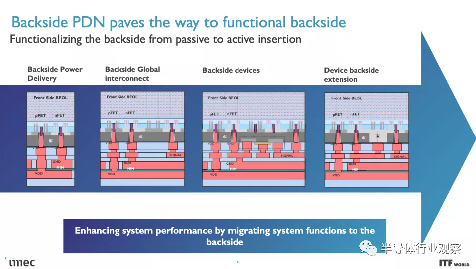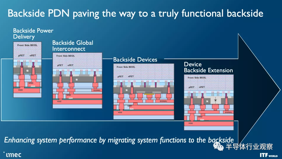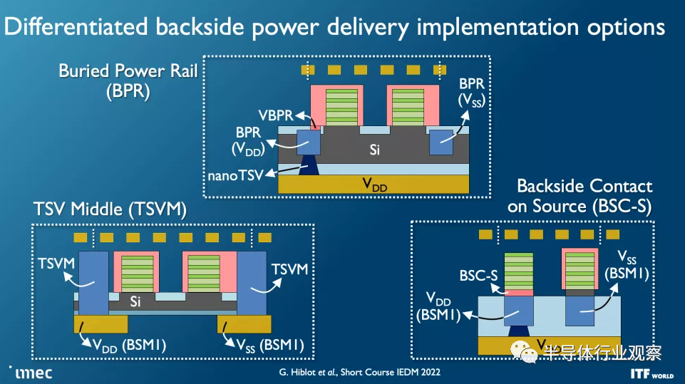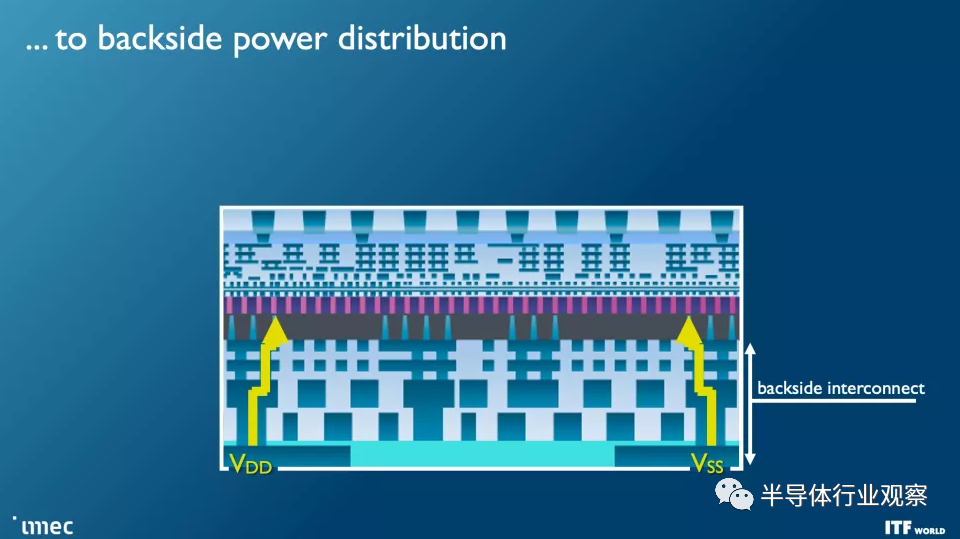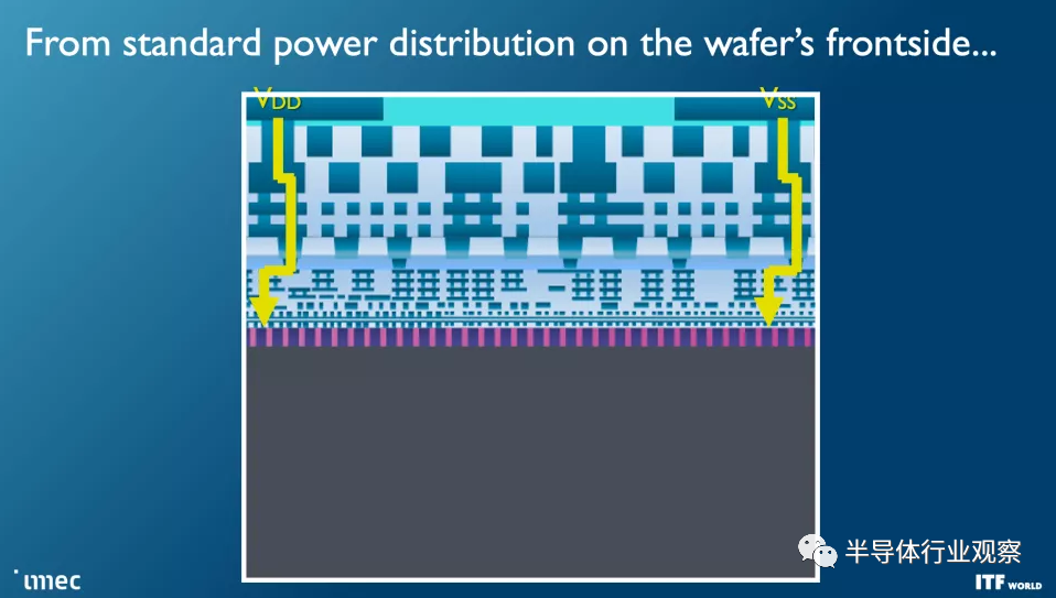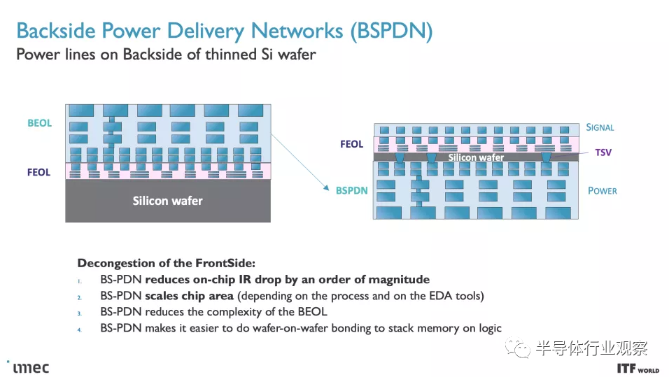 与当今从芯片顶部向下向晶体管传输功率的设计不同,背面配电网络 (BPDN:backside power distribution networks ) 使用 TSV 将所有功率直接路由到晶体管的背面,从而将功率传输与保留在其内部的数据传输互连分开另一边的正常位置。将电源电路和数据传输互连分开可改善压降特性,从而实现更快的晶体管开关,同时在芯片顶部实现更密集的信号路由。信号完整性也有好处,因为简化的布线可以更快地连接电阻和电容。