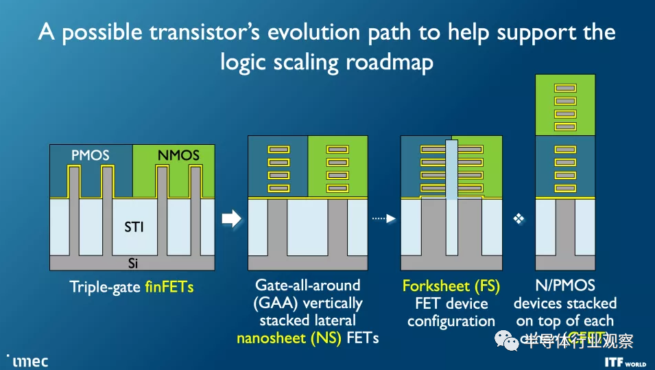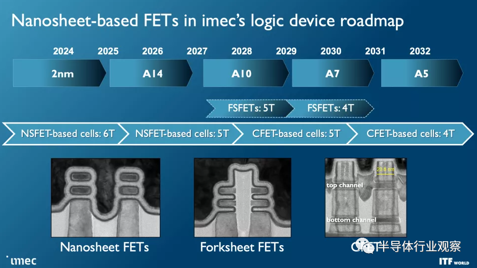 提醒一下,10 埃等于1纳米,因此Imec的路线图包含亚“1 纳米”工艺节点。该路线图概述了标准 FinFET 晶体管将持续到 3nm,然后过渡到新的全栅 (GAA) 纳米片设计,该设计将在 2024 年进入大批量生产。Imec绘制了 2nm和A7(0.7nm)Forksheet设计的路线图,随后分别是A5和A2的CFET 和原子通道等突破性设计。