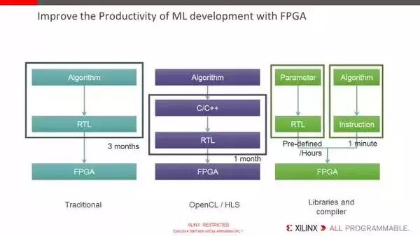 A:在FPGA上实现深度学习算法,如果有RTL开发的能力,可以使用Verilog或VHDL进行算法的实现,可以实现很高的性能,但是要求FPGA工程师的能力比较强,开发的周期也比较长;也可以通过C/C++语言,用HLS/SDSoC进行开发,需要工程师对HLS比较熟悉,知道怎么使用合适的#pragma把算法的行为告诉编译器,开发的周期比使用RTL会短一些;还有一种方式是使用Xilinx的机器学习堆栈,调用已经针对硬件优化的BLAS和DNN库进行开发,在保证性能的同时,可以实现很高的开发效率。