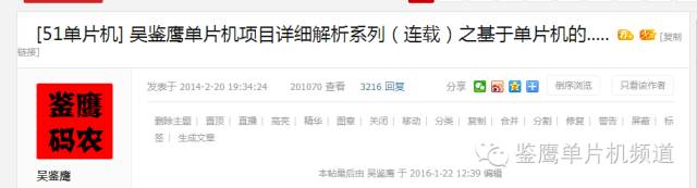 在论坛上发了一个连载帖子——吴鉴鹰单片机实战项目精讲,现在点击量已经突破20万,在这里吴鉴鹰谢谢各位网友的支持、关心和信任。