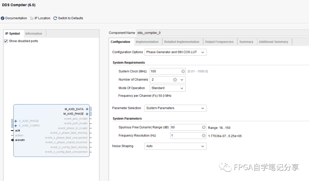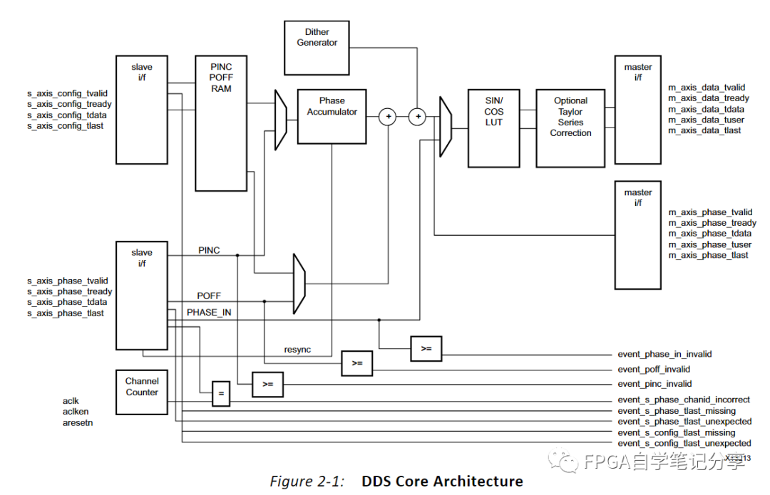 尽管DDS 函数在算法上很简单,但它们给硬件设计人员在实现函数时带来了巨大的挑战。例如,可能难以限制满足高 SFDR 要求或实现器件的最大时钟性能所需的内存量。通过利用XILINX的DDS Compiler IP,这些问题将得以解决,实现时只需图形化界面中点击一下即可。此外,ip还允许用户权衡DSP RAM LUT0等资源,以获得最适合其系统的解决方案。XILINX DDS Compiler IP的特性为:Phase 和 SIN/COS 值可以单独/同时生成栅格化特征消除了截位带来的相位噪声正弦、余弦或方波输出每个通道的累积相位重新同步(可选)分布式或块 RAM资源可选可选的相位抖动分散谱线能量以获得最大 SFDR(无杂散动态范围)相位抖动或泰勒级数校正选项使用最少的 FPGA 资源提供宽动态范围信号SFDR:18dB 至 150dB多达 16 个时分通道高达 48 位相位累加器(DSP 切片或 FPGA 逻辑)的低频分辨率3 位到 26 位带符号输出采样精度数字生成复数或实值正弦波的常用方法采用查找表方案。查找表存储了正弦波的样本。数字积分器用于生成合适的相位参数,该相位参数通过查找表映射到所需的输出波形。之前的文章:FPGA数字信号处理之verilog实现NCO(原理)及FPGA数字信号处理之verilog实现NCO(代码及仿真)对查找表实现DDS的原理进行了详细的说明,XILINX DDS Compiler IP的结构如下,可以看到该IP同样使用查找表的方法进行波形生成。