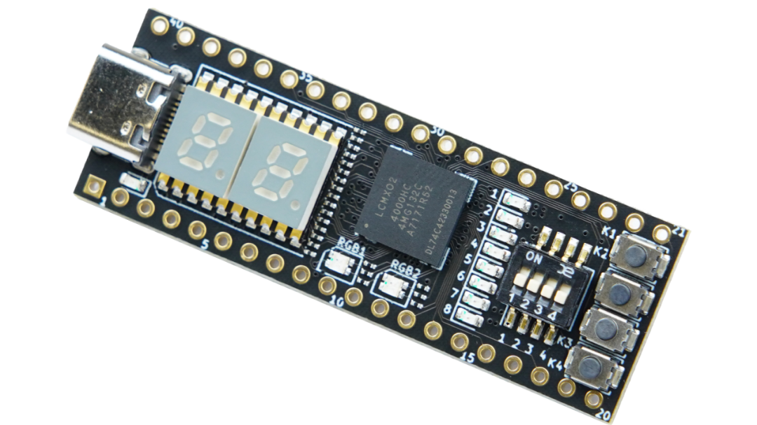 小脚丫STEP MXO2是一款超小巧40脚DIP结构的FPGA开发板。核心FPGA芯片选用了Lattice公司MXO2系列的4000HC产品,同时板上集成了编程器和按键、拨码开关、数码管、LED等多种外设资源。