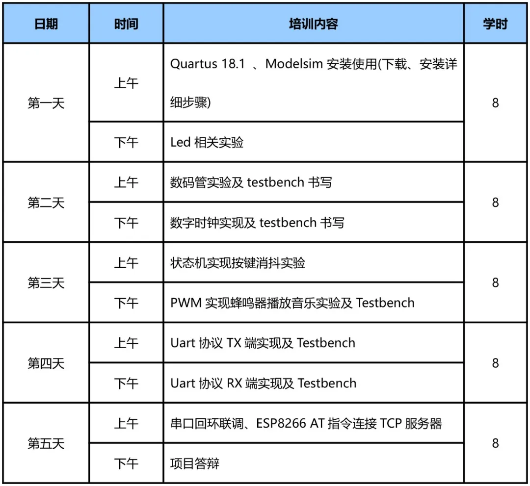 此次项目课程共1周时间,课程内容将知识理论与工程实践相结合。学员们通过实训项目《基于WIFI的FPGA报警系统》,使用由英特尔FPGA中国创新中心运营方海云捷迅自研的AIGO_C4MB 开发板卡深入学习FPGA,熟练掌握项目开发的完整流程、模块化设计、联合仿真、流程设计、布局布线、VHDL/Verilog嵌入式语言程序等的设计方法,成为理论与动手能力一体的专业优秀人才,为其即将到来的精彩从业之路奠定基础,累积训战经验,拓展行业视野。