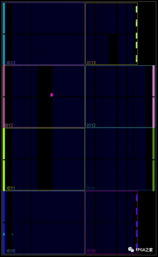 FPGA 芯片整体架构如下所示,大体按照时钟域划分的,即根据不同的工艺、器件速度和对应的时钟进行划分: