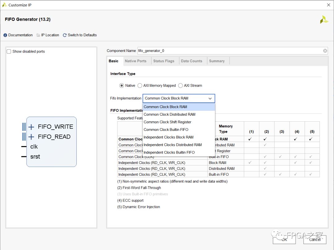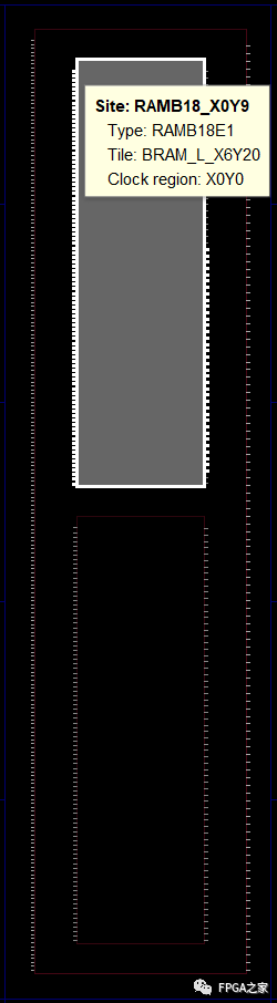 一个 BRAM 的大小为 36K Bits,并且分成两个小的 BRAM 各自为 18K Bits,排列成又分为上下两块,上半部分为 RAMB18 下半部分为 RAMBFIFO36。在 FIFO 例化的时候可以将 BRAM 设置为 FIFO 时,不会使用额外的 CLB 资源,并且这部分 RAM 是真双口 RAM。