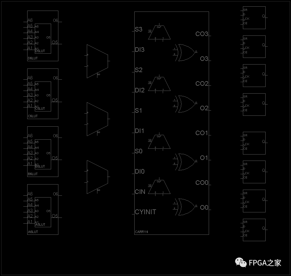 FPGA 的基本可编程逻辑单元是 CLB,而一个 CLB 是由查找表、数据选择器、进位链、寄存器组成的。查找表和多路选择器完成组合逻辑功能,寄存器(可配置成触发器或锁存器),完成时序逻辑功能。在赛灵思公司公司的 FPGA 器件中,一个 CLB 由多个(一般为 4 个或 2 个)相同的 Slice 和附加逻辑构成。