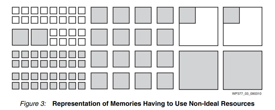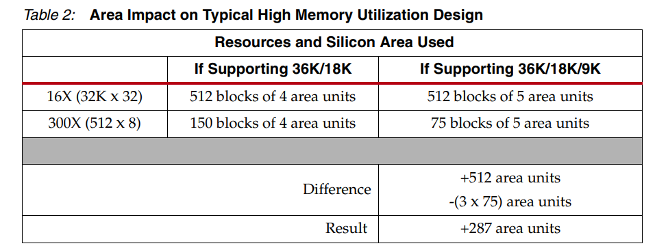 多个不同的资源利用了以不同大小配置块 RAM 资源的能力。 无穷小基块的代价 确定赛灵思 FPGA 架构提供了多种不同的存储器深度/宽度粒度后,了解向架构添加更精细基块所涉及的权衡非常重要。例如,如果 7 系列 FPGA 中的 36K 块 RAM 不仅分成两个 18K 块,而且可以进一步分成四个 9K 真双端口块,但这需要付出代价。将单个 Block RAM 中的唯一存储器数量加倍意味着要进出每个 Block RAM 的最大信号数量也需要加倍,这反过来又需要将互连资源(或块)的数量加倍以适应约 400 个信号的路由布线。 例如,一个 8K 块 RAM 可以配置为 16 位宽和 512 位深,总共需要 25 个输入信号----16 条数据线和 9 条地址线。然后 8K 块 RAM 分为两个 4K 块 RAM。这些块 RAM 中的每一个都可以配置为 16 位宽和 256 位深。此配置每个块 需要16 条数据线和 8 条地址线,每个 4K 块 RAM 总共有 24 个输入信号或总共 48 个信号。48 个信号大约是 8K 块 RAM 所需的 25 个输入信号的两倍。与每个关联的互连块数量增加一倍的效果 块 RAM 将硅面积增加了 25% — 无论使用何种配置,所有块都会受到惩罚。因此,每个 Block RAM 能够配置为四个 9K 块的能力意味着每个块从四个区域单元增加到五个区域单元。从积极的方面来说,它允许较小的存储器利用较小的块大小(参见表 2)。