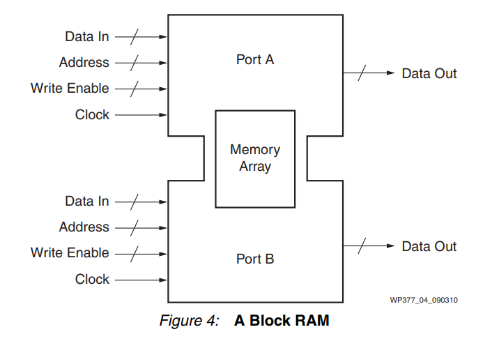 FPGA 制造商面临的挑战是构建具有最灵活的内存资源组合的设备,让所有用户能够将他们所需的内存阵列大小安装到设备中,同时实现所需的性能且不会浪费大量的资源和功耗。FPGA 中的存储资源 这一章是对BRAM资源的讲述,更详细的内容可以看这里:从底层结构开始学习FPGA----Block RAM(BRAM,块RAM) Xilinx FPGA 使用各种存储资源,以提供最好的灵活性和低成本组合。包括 Artix™-7、Kintex™-7 和 Virtex®-7 系列在内的所有 7 系列 FPGA 都使用相同的内存块,从而能够从一个 7 系列 FPGA 系列完美迁移到另一个系列。 显然,构建存储资源以满足每个用户的需求是一项艰巨的挑战。Xilinx 7 系列 FPGA 中实现的解决方案是创建称被为 块RAM 的基块(参见图 4),这些块基块可以组合在一起形成更大的阵列,也可以分割形成更小的阵列。将块 RAM 与 FPGA 逻辑中的 6 输入查找表 (LUT) 组合成小型存储器阵列的能力为用户提供了最灵活的资源来创建各种大小的存储阵列。
