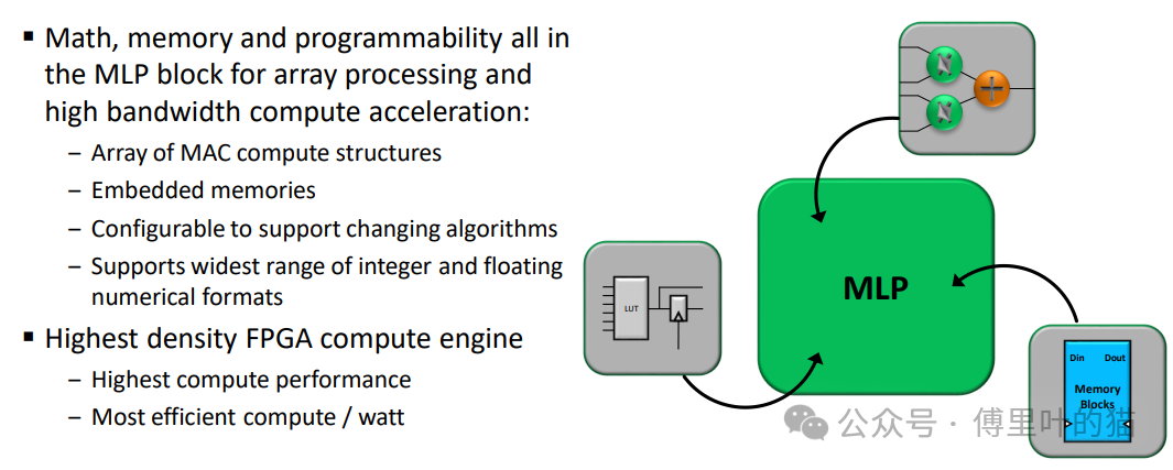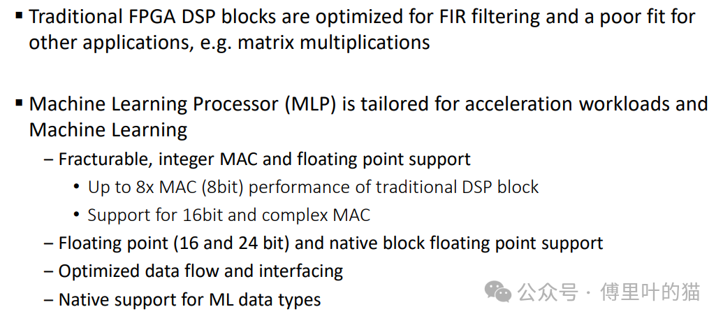 专为AI优化的计算引擎在AI高速发展的时代,Achronix专门为AI计算做了硬件上的优化:Modified Reconfigurable Logic Block (RLB) reduces LUT usage for multipliers by ~50%DSP64 replaced with Machine Learning Processor (MLP) targeting int16, int8, int4Optional custom functions in Speedcore