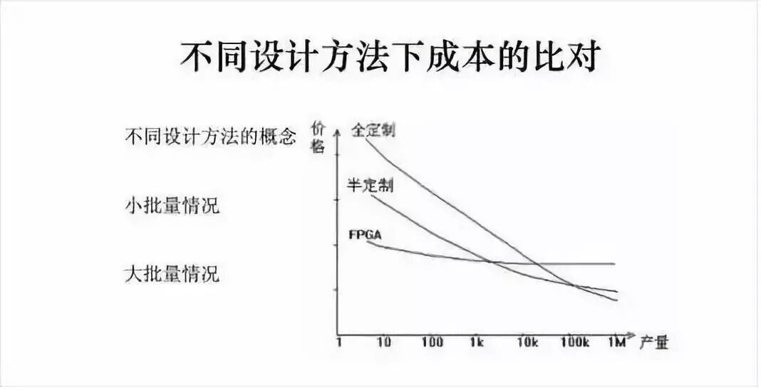 从设计成本来考虑,小批量上FPGA占优,大批量时,ASIC占优。
