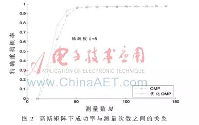 通过一维信号对优化OMP算法和OMP算法进行重建实验比较。假设稀疏信号x的长度N=256,稀疏系数k=6,OMP、优化OMP算法采用高斯随机测量矩阵RM×N,分别记录优化OMP算法和OMP算法的重建成功率,将其结果绘制成图,如图2所示。