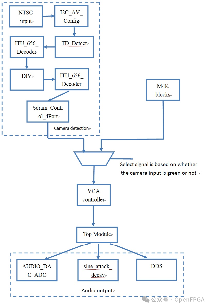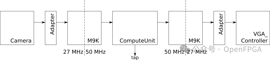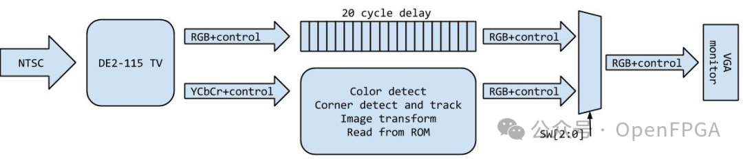 从 NTSC 视频信号开始,信号会进入FPGA中,一旦信号进入 FPGA,代码首先会执行中值滤波器、颜色检测器找到绿色像素区域,该区域被传递到角跟随器和角中值滤波器。图像从 ROM 加载并覆盖到视频流上,然后通过 VGA 输出。