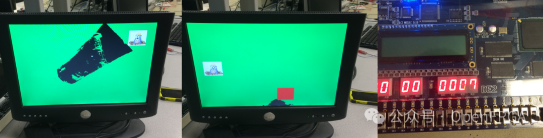 使用 Altera DE2 板设计了一款传统的打地鼠游戏。我们不是敲击键盘或触摸屏幕,而是通过使用绿色球拍将鼹鼠击向屏幕来玩游戏。使用相机来检测绿色。如果球拍中心击中目标,玩家将获得一分;另一方面,如果球拍中心击中布鲁斯(课程老师),玩家将失去 5 分。如果玩家达到15分,等级就会上升,后续目标的出现速度会加快。当我们点击图像或进入下一个关卡时,会根据动作产生不同的声音。