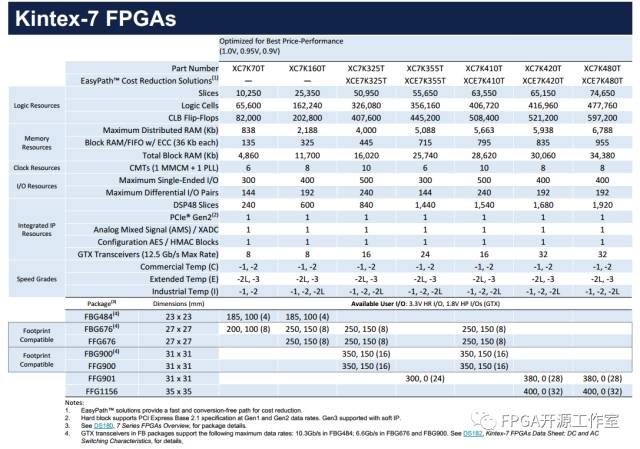 这是整个Kintex-7系列FPGA的内部逻辑资源的简要明细表,我们在选用FPGA芯片时,可以作为参考。