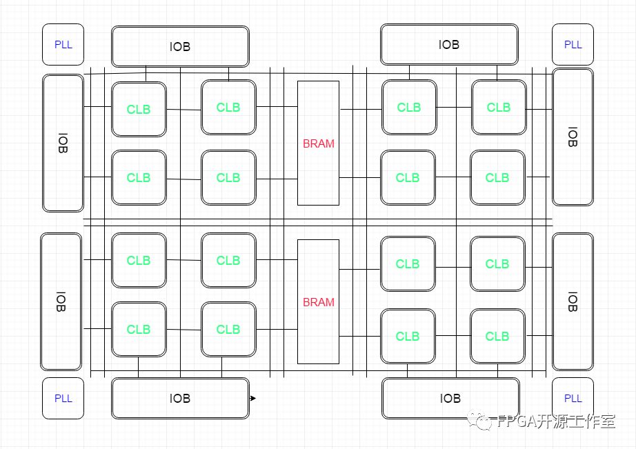 传统FPGA内部资源主要由IOB,CLB,BRAM以及丰富的内部布线等组成。具体的含义将在3.2节讲解。
