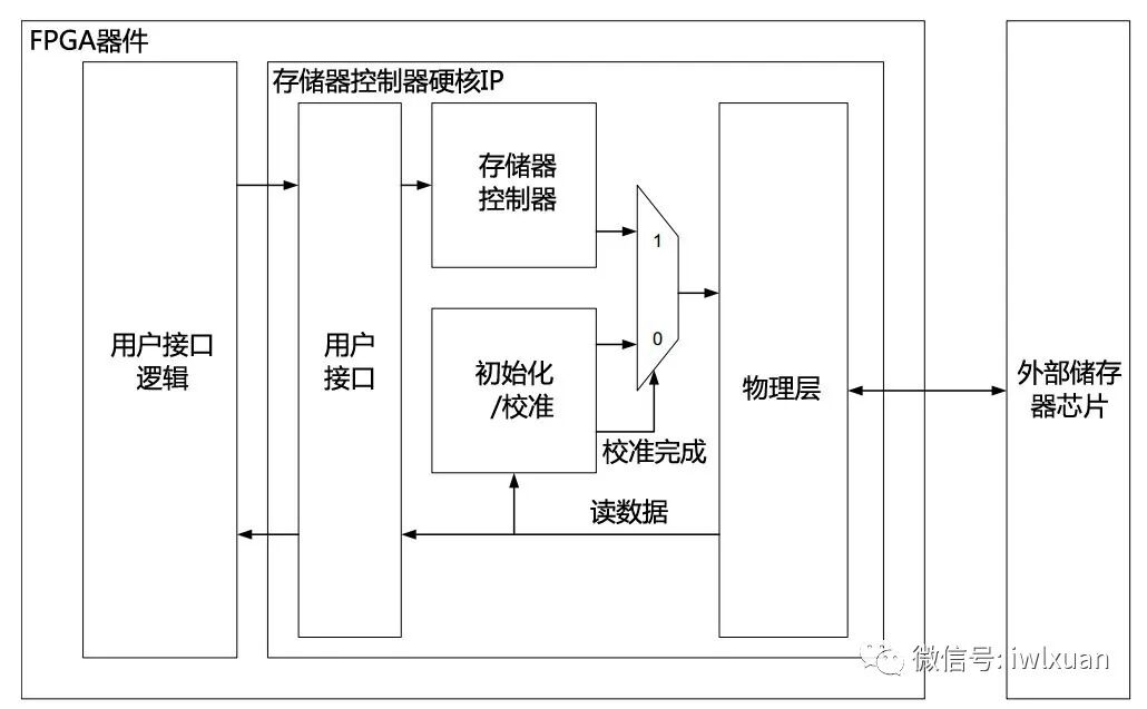 FPGA器件内部往往内嵌了一个多个DDR3/DDR4控制器硬核IP,包括用户接口(User Interface)模块、存储器控制器(Memory Controller)模块、初始化和校准(Initialization/Calibration)模块、物理层(Physical Layer)模块。