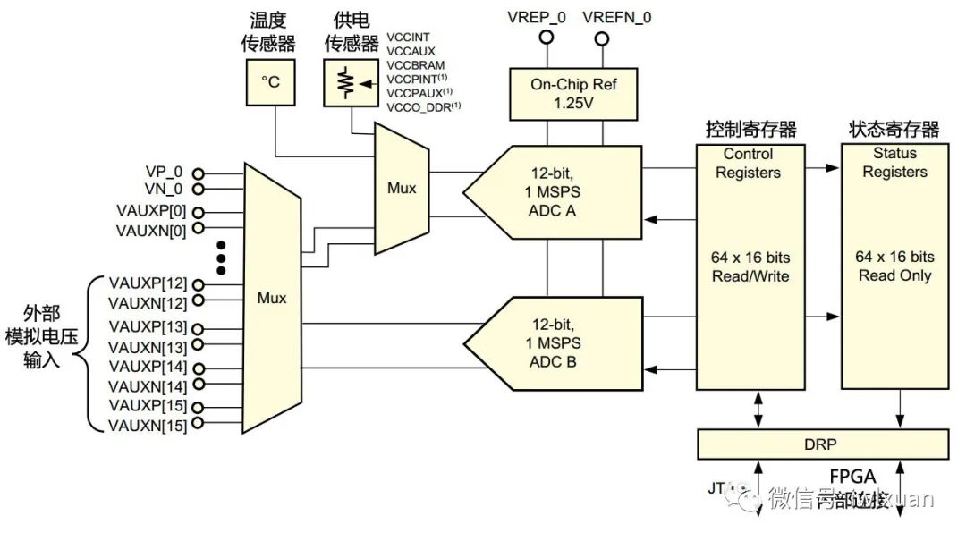 Xilinx FPGA器件特有的XADC(Xilinx Analog-to-Digital Converter)模块将模拟信号处理混合到FPGA器件。