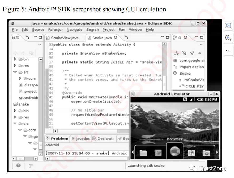 图5显示了一个安卓™SDK的屏幕截图。应用程序的编程是使用高级操作系统api完成的。编程是完全独立于实际的目标硬件,所以当实际针对最终设备时,重新编译是必要的。