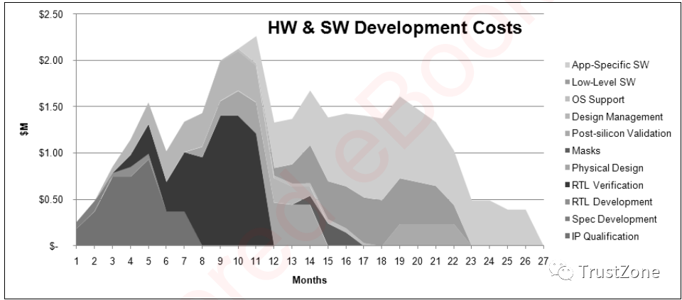 现在让我们考虑图3,它说明了芯片开发成本如何在典型的12个月的硬件设计周期中分布,从完整的规范到最终验证的RTL,准备布局。