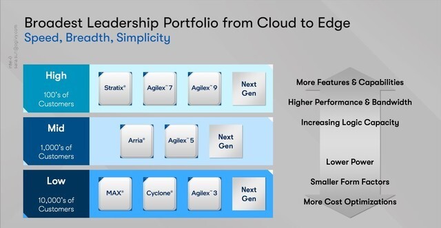 值得一提的是,在英特尔拆分PSG部门之前,在FPGA产品的研发速度上是相当稳固甚至是有些激进的,光在去年就推出了十余款产品,而为了更好地满足客户在网络、通信基础设施、低功耗嵌入式等方面的需要,Altera的解决方案特别是旗下的旗舰级产品Agilex系列也会进一步优化。