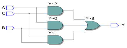 下面利用一个三人表决器的电路设计来说明一些问题。此电路有三个输入(A、B、C),一个输出(Y),只有当两个及两个以上输入赞成时,Y输出赞成。