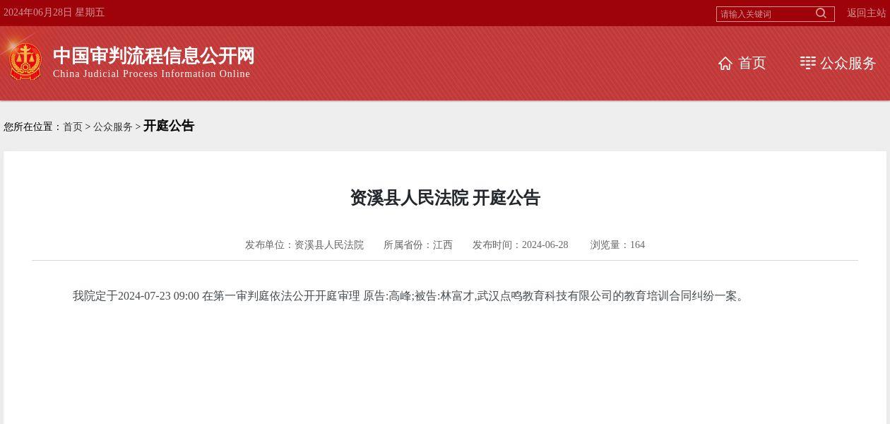 据中国审判流程信息公开网消息,江西省资溪县人民法院于2024年7月23日09:00在第一审判庭依法公开开庭审理林富才,武汉点鸣教育科技有限公司的教育培训合同纠纷一案。