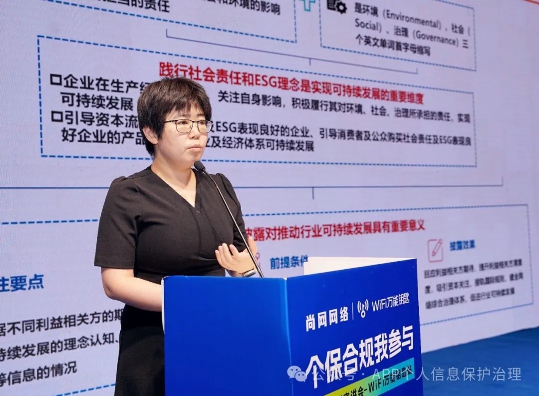 中国信通院泰尔认证中心专家常琳就《个人信息保护社会责任信息披露的实践及挑战》进行了探讨。分享了当前企业在个人信息保护方面的最新实践,包括加强内部数据管理、提升信息透明度、优化用户隐私设置等关键措施,并提出企业在实际操作中所面临的难点及解决方案。