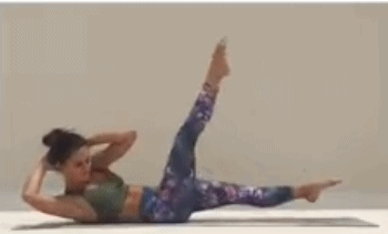 仰卧,双手抱住后脑勺,抬起双腿离地呼气扭转向右,右腿抬高,左手肘碰到右膝盖外侧然后换边,做5组